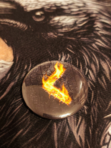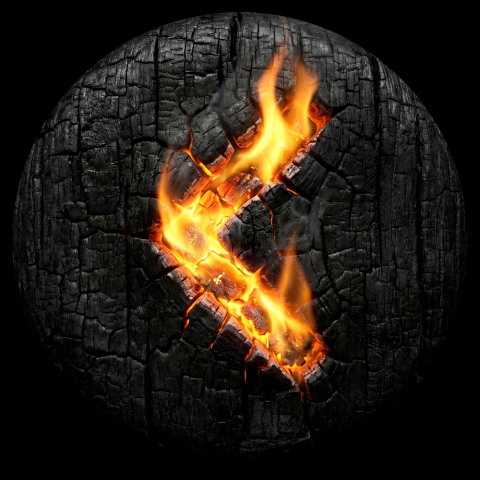 Tento design sází na maximální kontrast. Podklad imituje strukturu hluboce ohořelého dřeva (uhel), které je matně černé a rozpraskané žárem. Samotná runa Kenaz uprostřed září jasným žluto-oranžovým světlem, které vypadá jako žhavé uhlíky nebo živý oheň hořící uvnitř materiálu. Tento efekt "Glow" symbolizuje světlo poznání, které září i v té nejhlubší tmě.